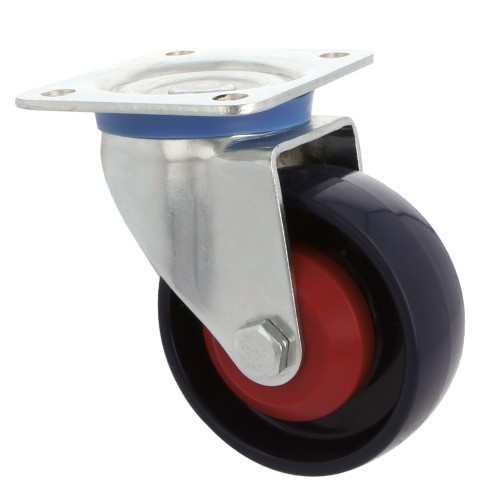 Rueda de nylon azul. Con pletina metálica. Con rodamiento de bolas. Diseñadas para cargas elevadas.
