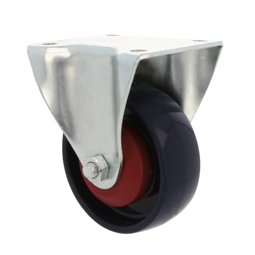Ruedas de nylon color azul con rodamientos de bolas con placay. Contiene pletina metalica fija. Son livianas, duraderas, silenciosas y de baja fricción.