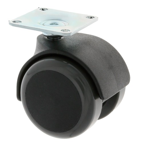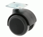 Rueda de nylon negro con banda de poliuretano gris. Con pletina. Sistema de fijación con tornillos. Recomendadas para mobiliario y mueble de oficina.