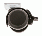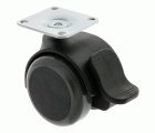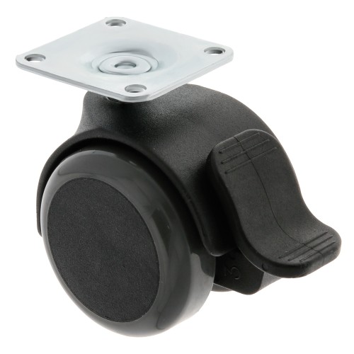 Rueda de nylon negro con banda de poliuretano gris. Con pletina y freno. Sistema de fijación con tornillos. Recomendadas para mobiliario y mueble de oficina.