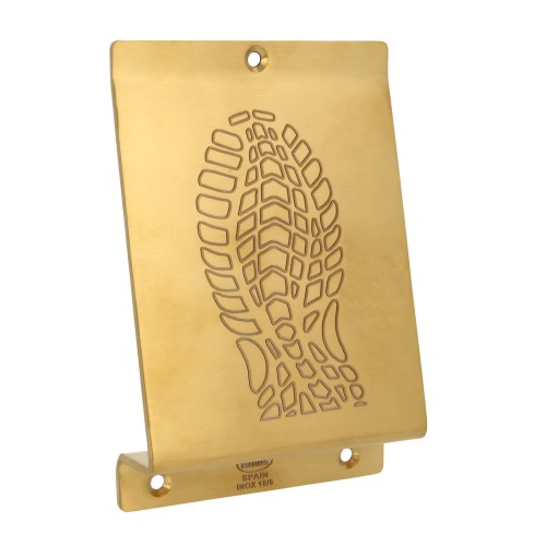 Pedal de pie para empuje de todo tipo de puertas pesadas. En dorado, un color neutro muy combinable con cualquier tipo de acabado de puertas. Con impresión de huella de zapato a contraste. Instalación fácil y rápida. Se incluyen tornillos para su colocación.