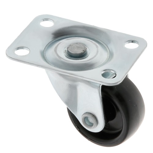 Rueda de nylon negro con pletina giratoria de acero zincado. Ruedas con diferentes aplicaciones, utilizadas para el transporte de cargas ligeras como muebles de oficina, percheros, mobiliario ligero, etc…