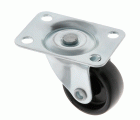 Rueda de nylon negro. Pletina giratoria de acero zincado. Sistema de fijación con tornillos. Recomendadas para mobiliario y mueble de oficina.