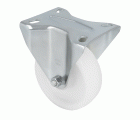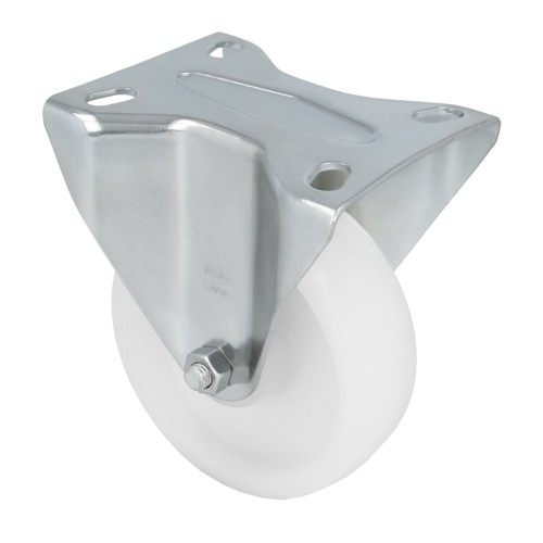 Ruedas fijas con pletina metálica. Esta diseñado con una banda y un núcleo de nylón blanco. Son livianas, duraderas, silenciosas y de baja fricción.