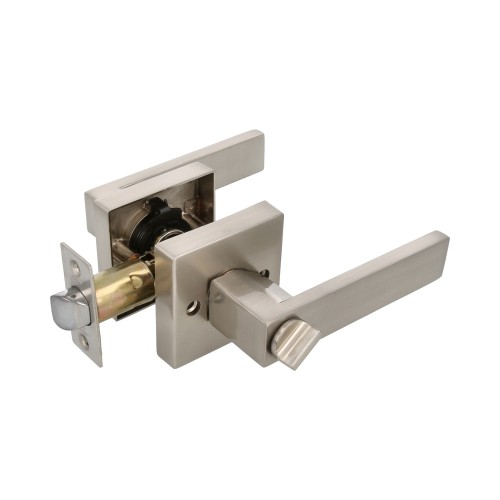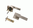 Juego de manillas con picaporte de entrada 60/70 mm incluido. Picaporte de canto cuadrado con dispositivo de seguridad antitarjeta. Función Entrada, con llave exterior y condena interior: el sistema queda liberado cuando se desbloque a por medio de la llave o de la condena y se bloquea de la misma manera. Para puertas de madera de anchura de 30 a 45 mm.