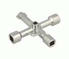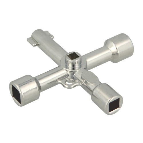 Llave multifunción de 4 vías fabricada en acero niquelado. Tamaño compacto y forma en cruz para facilita su transporte y utilización.