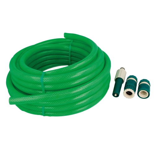 Kit de manguera trenzada flexible de PVC. Triple capa y refuerzo de poliéster. Gran flexibilidad y resistencia a la presión. El color exterior transparente y el interior verde. Temperatura de trabajo entre -20 ºC y 60 ºC. Con accesorios de riego incluidos.