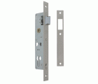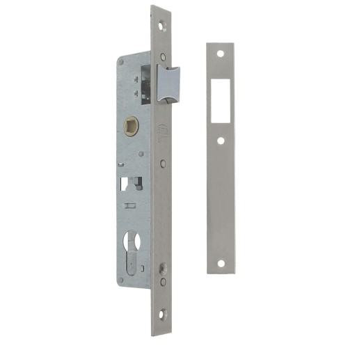 Cerradura de embutir para perfiles europeos de carpintería metálica. Picaporte reversible. Sin palanca de cierre, especial para portales. Alojamiento para cilindro Europerfil con leva de 15 mm. Distancia entre nueca de manilla y alojamiento de cilindro: 85 mm. Frente y soporte de acero. Nueca para manilla de 8 mm.