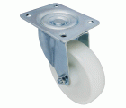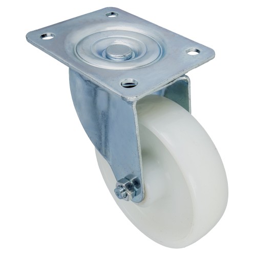 Rueda de nylon blanco. Con pletina metálica. Con rodamiento de rodillos. Diseñadas para cargas elevadas.