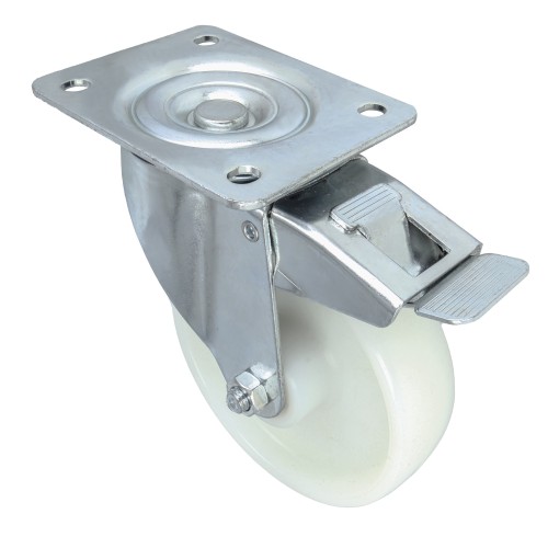Rueda de nylon blanco. Con pletina metálica y freno. Con rodamiento de rodillos. Diseñadas para cargas elevadas.