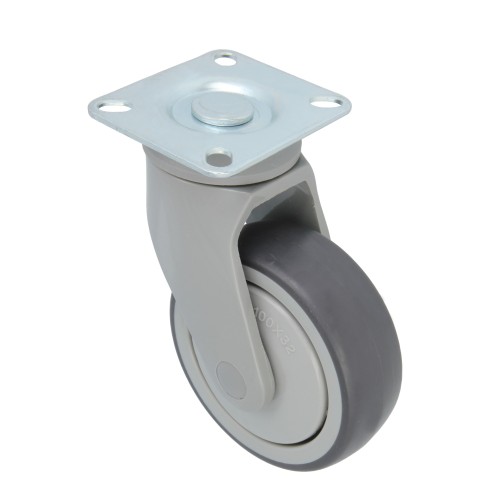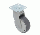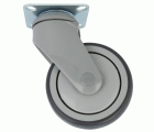 Rueda con pletina metálica y soporte de nylon. Banda de goma gris de caucho termoplástico y núcleo de polipropileno gris. Rodamientos de bolas. Diseñado para usos hospitalarios, hostelería y similares