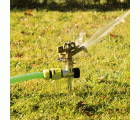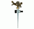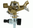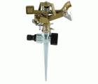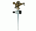Aspersor sectorial con cabeza fabricada en latón y acero inoxidable. Pincho metálico. Con conector rápido. Rotación de 360°. Superficie de riego 95 m².