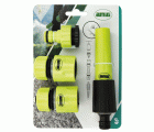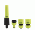 Kit de riego fabricado en ABS. 1 lanza de riego. 1 adaptador+reductor 1/ 2''-3/4''. 2 empalmes rápidos de manguera de 1/2'' y 3/4'' con función Stop.