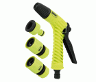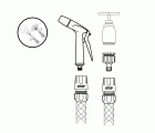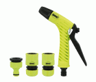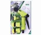 Kit de riego fabricado en ABS. 1 pistola de riego. 1 adaptador+reductor 1/2''-3/4''. 2 empalmes rápidos de manguera de 1/2'' y 3/4''. Con función Stop.