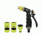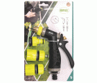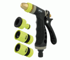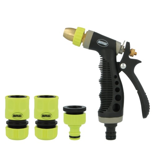 Kit de riego fabricado en ABS. 1 pistola de riego de latón con goma. 1 adaptador+reductor 1/2''-3/4''. 2 empalmes rápidos de manguera de 1/2'' y 3/ 4''. Con función Stop.