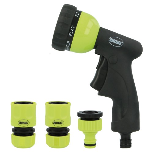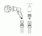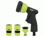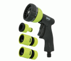 Kit de riego fabricado en ABS. 1 pistola de riego de 7 funciones. 1 adaptador+reductor 1/2''-3/4''. 2 empalmes rápidos de manguera de 1/2'' y 3/4''. Con función Stop.