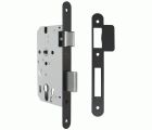 Cerradura de embutir para puertas de madera con paletón de cierre y canto redondo. Frente, soporte y picaporte reversible con acabado negro mate. No incluye llaves, cilindro ni escudo de seguridad.