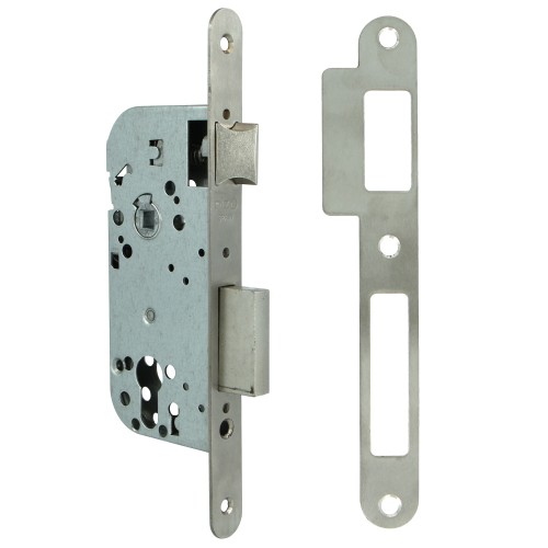 Cerradura de embutir para puertas de madera con paletón de cierre. Canto redondo. Frente y soporte en acero inoxidable. Picaporte reversible. Di stancia entre nueca de manilla y alojamiento de cilindro europerfil: 70 mm. Nueca para manilla de 7 mm. Sin cilindro, incluye bocallave.
