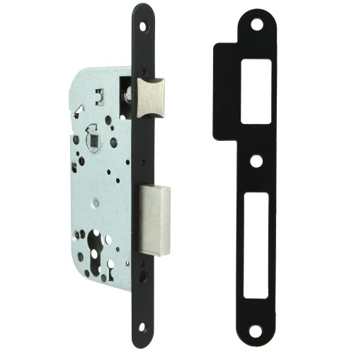 Cerradura de embutir para puertas de madera con paletón de cierre. Canto redondo. Frente y soporte en acero. Picaporte reversible. Distancia entre nueca de manilla y alojamiento de cilindro europerfil: 70 mm. Nueca para manilla de 7 mm. Sin cilindro, incluye bocallave.