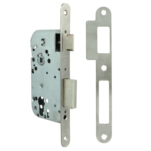 Cerradura de embutir para puertas de madera con paletón de cierre. Canto redondo. Frente y soporte en acero inoxidable. Picaporte reversible. Di stancia entre nueca de manilla y alojamiento de cilindro europerfil: 70 mm. Nueca para manilla de 8 mm. Sin cilindro, incluye bocallave.