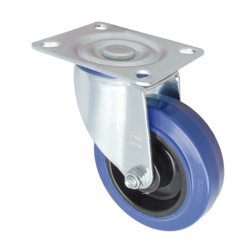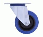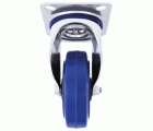 Rueda con pletina metálica y núcleo de nylon. Banda de rodadura de goma azul elástica. Con rodamiento de rodillos. Se aplica en útiles de transporte logístico, talleres, carros de herramientas, carros tubulares, logística, fabricas neumáticos, útiles de transporte, carros de transporte de alimentación, cocina, supermercados, contenedores.