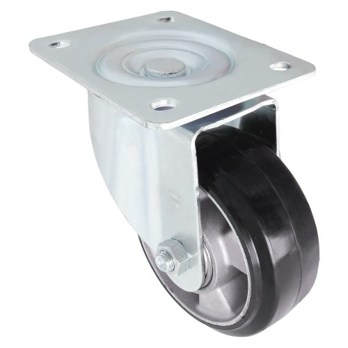 Rueda con pletina metálica y núcleo de aluminio fundido. Banda de rodadura de goma negra. Con rodamiento doble de bolas. Su uso es aplicable en: contendores, roll-palets, carretillas industriales, manutención de factorías, talleres, conserveras, mataderos, granjas agrícolas.
