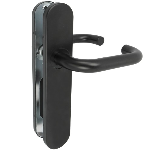 - JUEGO DE MANILLAS CON PLACA: Juego de manillas de acero con placa de polipropileno, para puertas de interior o exterior. Con cómoda manivela funcional y ergonómica que se adapta a la mano y no resbala. Se recomienda limpiar con un paño húmedo.