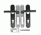 Juego de manillas fabricadas en acero inoxidable y con placa interior de acero niquelado. Cuadradillo de 8 mm. Incluye tornillos pasantes antirrobo y accesorios de instalación.