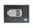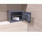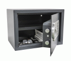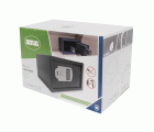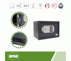 Caja fuerte de sobreponer fabricada en acero de alta calidad. Sistema de apertura eléctrico con accionamiento con pomo. Indicador luminoso (verde, amarillo y rojo). Botón de reseteado para cambio de código. Dos bulones de acero de Ø20 mm. Con agujeros para sufijación en la pared y accesorios de fijación a la pared. Incluye moqueta.