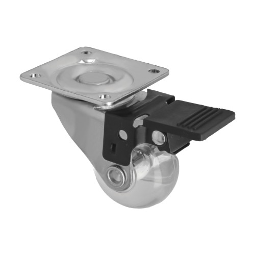 Rueda de poliuretano transparente. Con pletina metálica y freno. Para el transporte de cargas ligeras.