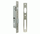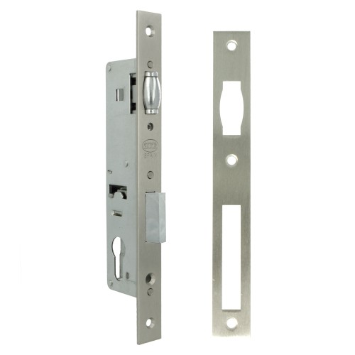 Cerradura de embutir para perfiles europeos de carpintería metálica. Picaporte de rodillo y palanca de cierre deslizante. Accionamiento sólo por medio del cilindro. Alojamiento para cilindro Europerfil con leva de 15 mm. Distancia entre nueca de manilla y alojamiento de cilindro: 85 mm. Frente y soporte de acero.