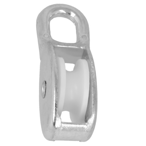 Polea simple fija con rueda de plástico blanca. No apto para trabajos de elevación.