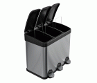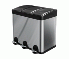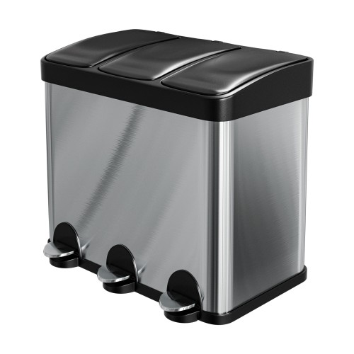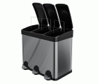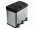 Cubo de reciclaje triple. Capacidad: 3 x 15 l. Cuerpo fabricado en acero inoxidable de alta calidad. Tapa y base de plástico negro. Con 3 cubos de plástico extraíbles con asa. Pedal de apertura.