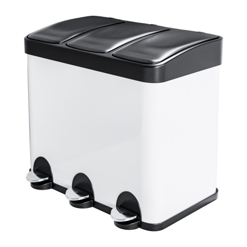Cubo de reciclaje triple. Capacidad: 3 x 15 l. Cuerpo fabricado en acero pintado de alta calidad, resistente a las huellas y a las manchas. Tapa y base de plástico negro. Con 3 cubos de plástico extraíbles con asa. Pedal de apertura.