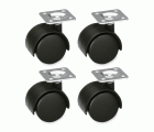 Juego de 4 ruedas de nylon negro con pletina. Sistema de fijación con tornillo. Recomendadas para mobiliario y mueble de oficina.