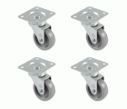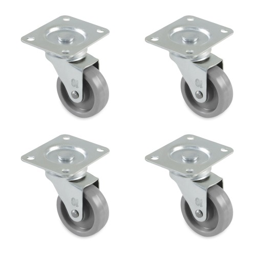 Juego de 4 ruedas de nylon gris con pletina y rodamientos. Buen coeficiente de rozamiento y aislamiento eléctrico. Uso semi-industrial y mobiliario.