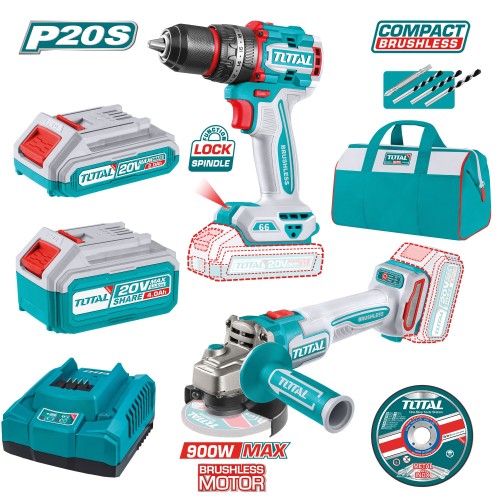 TOTAL K00126 | Pack taladro percutor + Amoladora brushless a batería TCKLI20273E | 20 V