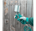 Pistola de pulverizado de aire comprimido. Depósito superior de 400 cc. Boquilla estándar de 1,5 mm. Anchura de patrón de 180-250 mm. Presión de funcionamiento 3 - 4 bar. Boquillas opcionales de 1,2 1,8 mm.