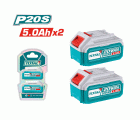 Conjunto de 2 baterías de 20 V de 5 Ah. Compatibles con las herramientas TOTAL P20S. Presentadas en blister.