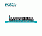 Juego de 10 vasos de impacto de 3/8''. Medidas de 8, 10, 12, 13, 14, 15, 17 y 19 mm. Incluye adaptador 3/8'' a 1/2'' y adaptador 1/4'' a 3/8''. Fabricados en Cr-Mo con extrusión fría.