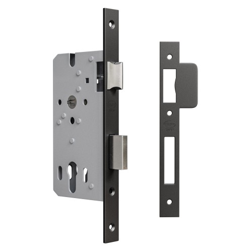 Cerradura de embutir para puertas de madera con paletón de cierre. Canto cuadrado. Frente y soporte en acero. Picaporte reversible. Distancia entre nueca de manilla y alojamiento de cilindro Europerfil: 70 mm. Entrada: 50 mm. Nueca para manilla de 8 mm. Sin escudo ni cilindro.